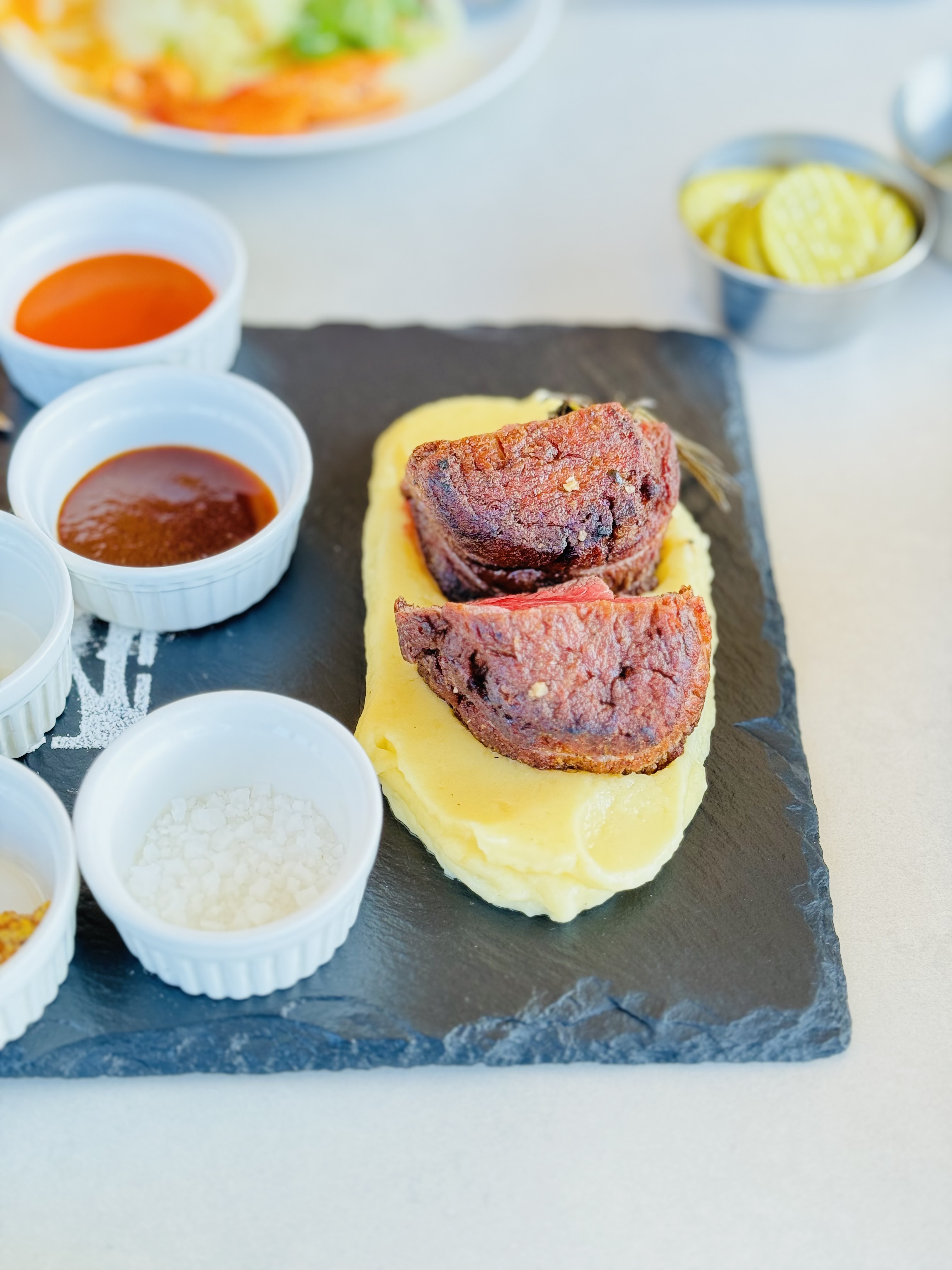 미디움 레어로 잘 구워진 안심은 육즙이 풍부하고 부드럽다. 고기의 담백한 맛을 제대로 느낄 수 있었고, 크리미한 감자 퓨레와 홀그레인 머스타드, 바비큐 소스, 소금 등 다양한 소스가 제공돼 취향에 맞게 즐길 수 있다. 고급스러운 맛과 질감으로 고기 좋아하는 사람이라면 강력 추천한다.