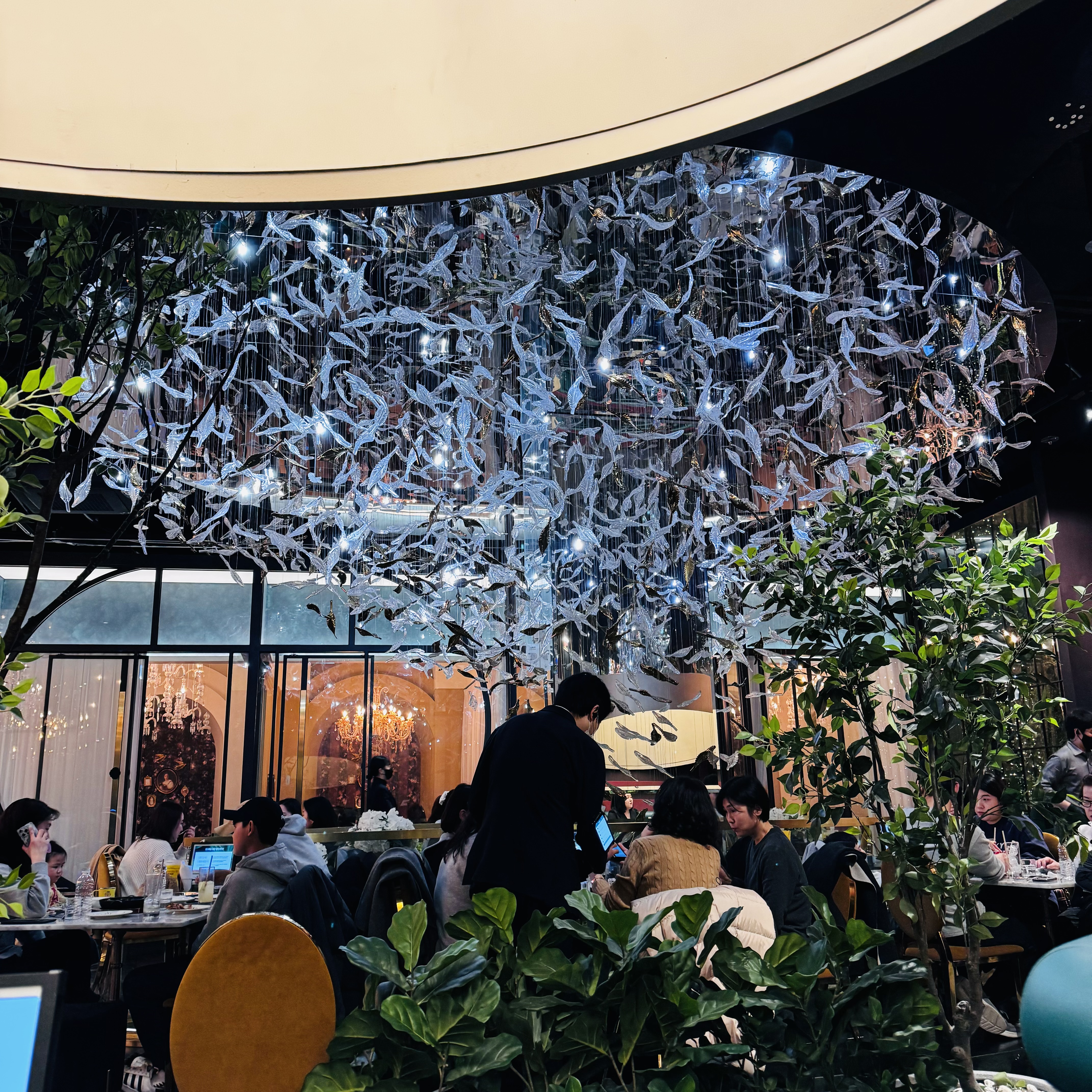 디라이프스타일키친은 롯데월드몰 5층에 위치해 있어 접근성이 매우 좋아요. 에스컬레이터를 타고 올라가면 마치 갤러리처럼 꾸며진 공간이 펼쳐집니다. 내부는 실내 정원 느낌으로 꾸며져 있고, 천장에 매달린 수많은 유리 새 장식이 정말 인상 깊었어요. 마치 숲속에 온 듯한 포근한 분위기가 식사를 더욱 특별하게 만들어줍니다.